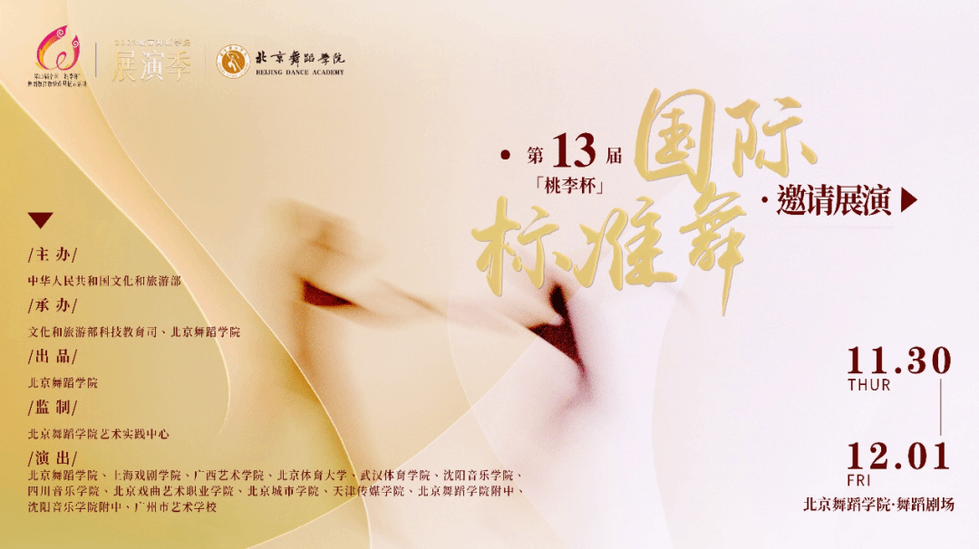 From November 30th to December 1st, the 13th "Peach and Plum Cup" National Youth Dance Education Achievement Show —the Invitational Performance of International Ballroom Dance was held at the Dance Theater of Beijing Dance Academy, which is hosted by the Ministry of Culture and Tourism of the People's Republic of China and organized by the Department of Technology and Education of the Ministry of Culture and Tourism, and the Beijing Dance Academy.