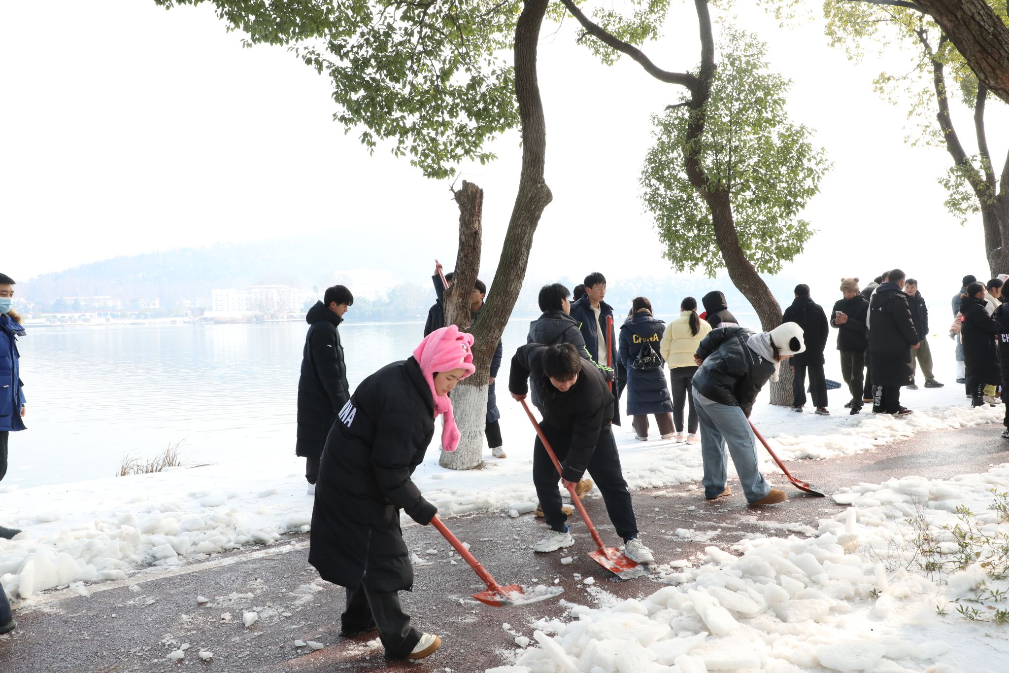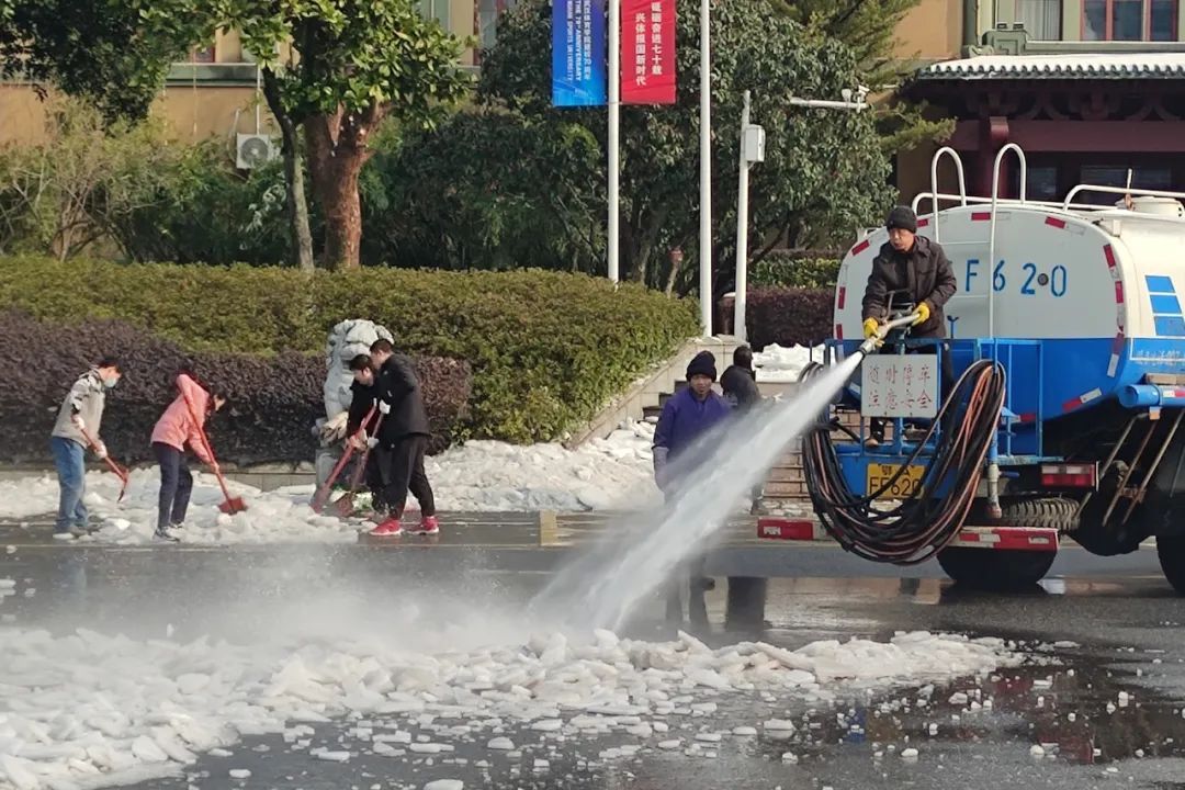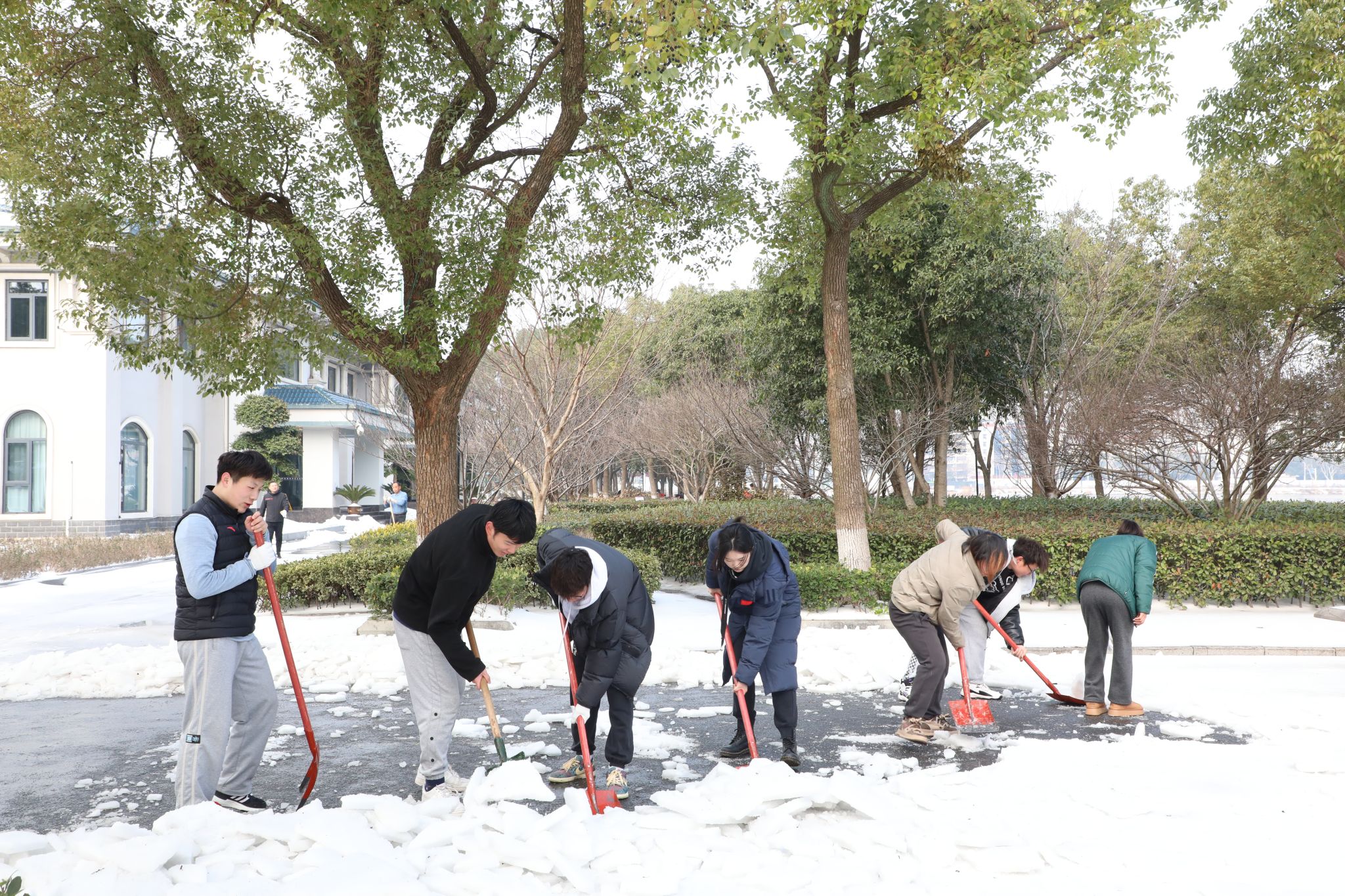 Before the Spring Festival, WHSU had been swept by freezing rain. This time, it was tested by graupel. Graupel is harder than snow, melts more slowly, and freezes more easily. As the new term is about to begin, the Party Committee of WHSU attached great importance to and actively deployed the work of removing graupel and ice. Staff members gathered again and quickly joined the team to shovel ice and snow pellets, going all out for the students to return to the campus safely.