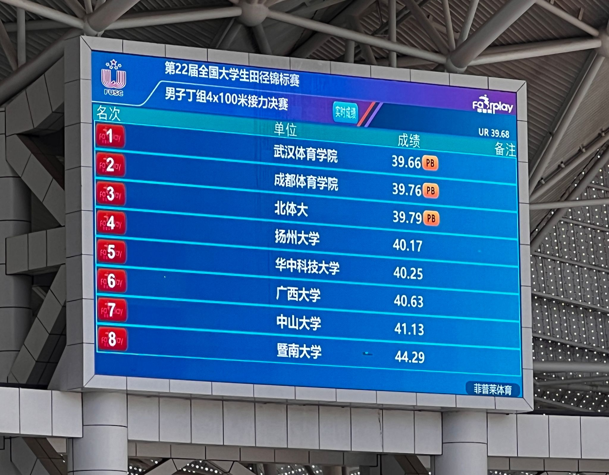 During the competition, the athletes demonstrated outstanding speed and explosive power, as well as nearly perfect baton passing techniques. They finished first with a time of 39.66 seconds, breaking the seven-year-old record for this event, which was previously held by Tsinghua University (39.68 seconds).
