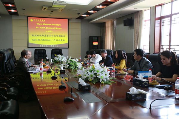 Ajit Mohan Sharan want to know about issues such as short training programs between the foreign sports team and our school, Vice secretary of Lee gefei answered his questions one by one. The Mr. Ajit expressed that they can learn the sports development experience from Wuhan sports University, to promote the development of sports undertakings in India. At the same time hope that through with our school signed a memorandum of understanding, to further strengthen exchanges and cooperation between each other. At last, he said, while the visiting is less than a day, but the beautiful scenery, attractive campus activities and perfect sports facilities in our campus impressed him a lot, but even more touched by the warm reception of our school.
