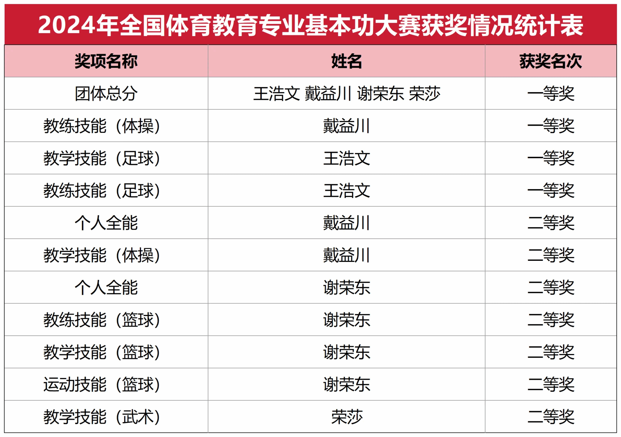 From November 11 to 15, the 2024 National Fundamental Skills Competition for Physical Education Students was held in Shenyang, Liaoning Province. The representative team from Wuhan Sports University (WHSU) delivered an outstanding performance, clinching the first prize for the overall team score, along with three individual first prizes and seven individual second prizes.