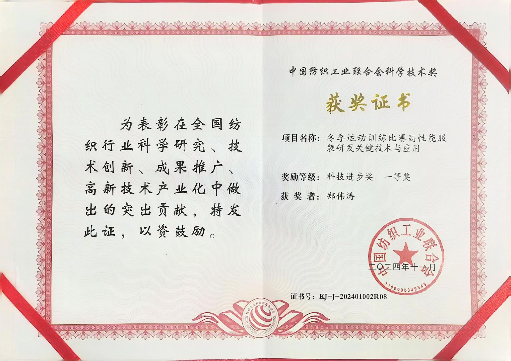 On November 12, the Science and Technology Award Conference of the China National Textile and Apparel Council was held at the Great Hall of the People in Beijing. The conference announced the winners of the 2024 China National Textile and Apparel Council Science and Technology Progress Award and recognized the awarded organizations and individuals. The “Science and Technology for the Winter Olympics” project, titled “Key Technologies and Applications for Developing High-performance Clothing for Winter Sports Training and Competitions,” involving faculty and students from the Wuhan Sports University (WHSU), was awarded the first prize for scientific and technological progress.